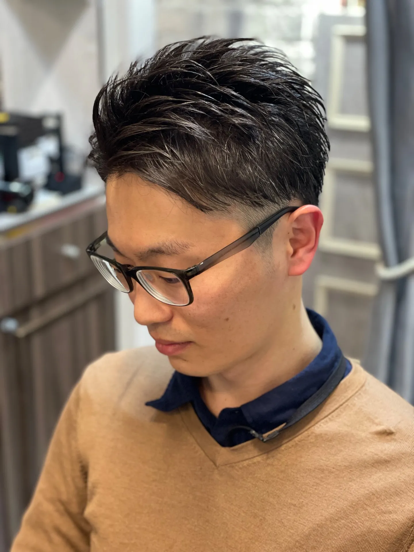 写真のスタイルは、サイドと襟足をすっきり刈り上げ、トップに程よく長さを残して動きを出したデザイン。